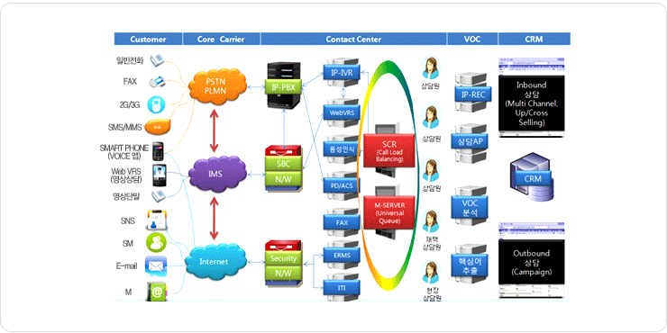 - Multi Media Universal Queue Routing : PSTN, VoIP, Chat, E-Mail 등을 통합한 Routing
